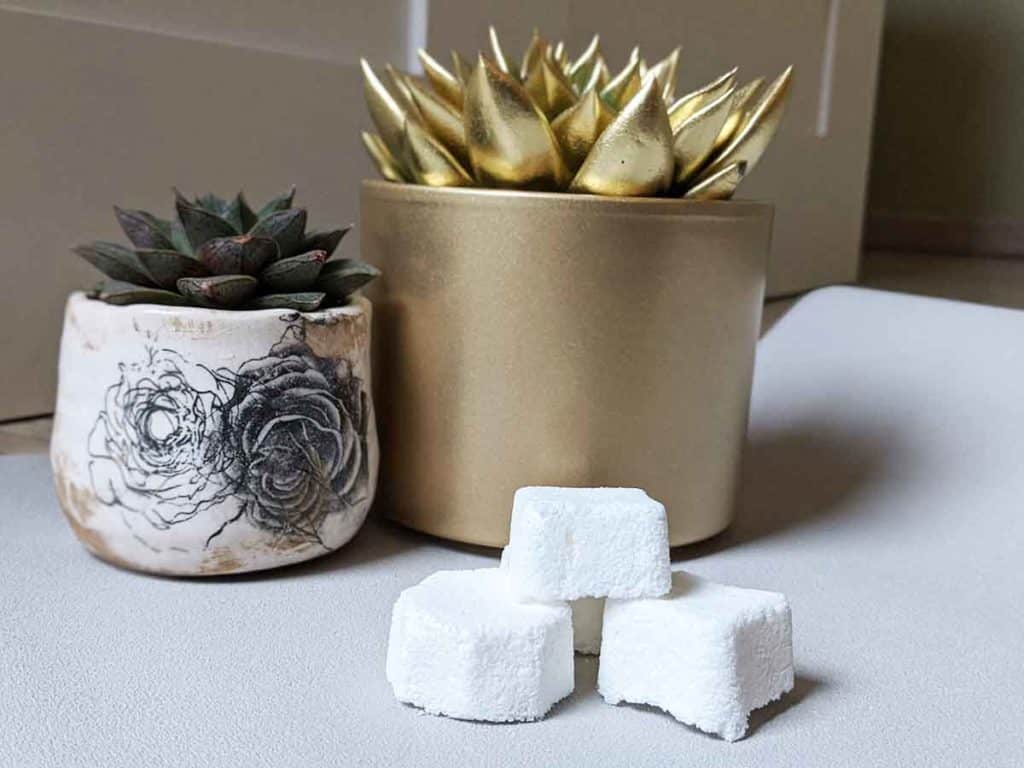 Pour former les pastilles, on utilise un bac à glaçons ou un moule pour mini gâteau (en silicone) dans lesquels on va disposer des portions de la préparation initialement sous forme de poudre. Le fait d’ajouter un peu d’eau dans la préparation va créer une réaction qui va lier les ingrédients. Une fois sec, le produit va durcir pour former des tablettes pré-dosées. Le temps de séchage est d’environ 24 heures. Ensuite, on démoule les pastilles pour les stocker dans un bocal avec couvercle. Il est préférable utiliser un bocal hermétique afin d’empêcher l’humidité d’altérer les pastilles. Elles conserveront ainsi toute leur efficacité.